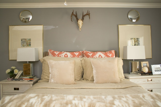 Then of course there is the room where the masterful designer makes implied lines work to fantastic advantage. In this space the lamps extend the visual line of the headboard and creates great bottom weight for the large scale, highly textured IKEA shade.